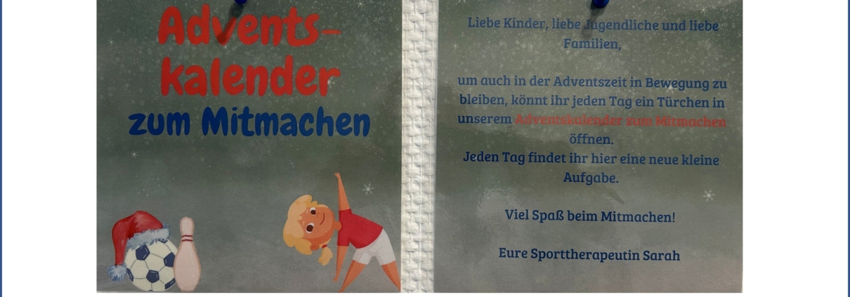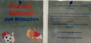 Sowohl auf der kinder-onkologischen als auch auf der Knochenmarktranslantations-Station und den Ambulanzen gibt es vor Weihnachten auch Adventskalender – und zwar ganz besondere: von unserer Sporttherapeutin! Wenn man die Türchen öffnet, dann gibt es keine Schokolade oder ein Geschenk, sondern eine kurze aber effiziente Sport-Übung. Denn Sport soll nicht nur die Kinder stärken, sondern sie auch besser und insbesondere schneller die Therapie durchstehen lassen: damit es möglichst bald wieder nach Hause in ein normales Leben geht!