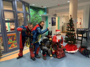 Die  Höhenretter der Feuerwehr Düsseldorf überraschten die krebskranken Kinder der Klinik für Kinder-Onkologie an der Uniklinik in Düsseldorf. Als Nikolaus, Batman, Superman und Spiderman verkleidet, seilten sie sich vom Dach der Kinderklinik ab und verteilten Geschenke! Die Kinder in den Isolationszimmern konnten durch den Fenstereinsatz in den Türen die Feuerwehrmänner sehen und Fotos von Ihnen machen. Nach 1,5 Stunden Besuch in den Stationen und Ambulanzen sind die „Superhelden“ wieder „davongeflogen“…..und hinterließen viele freudige Gesichter!