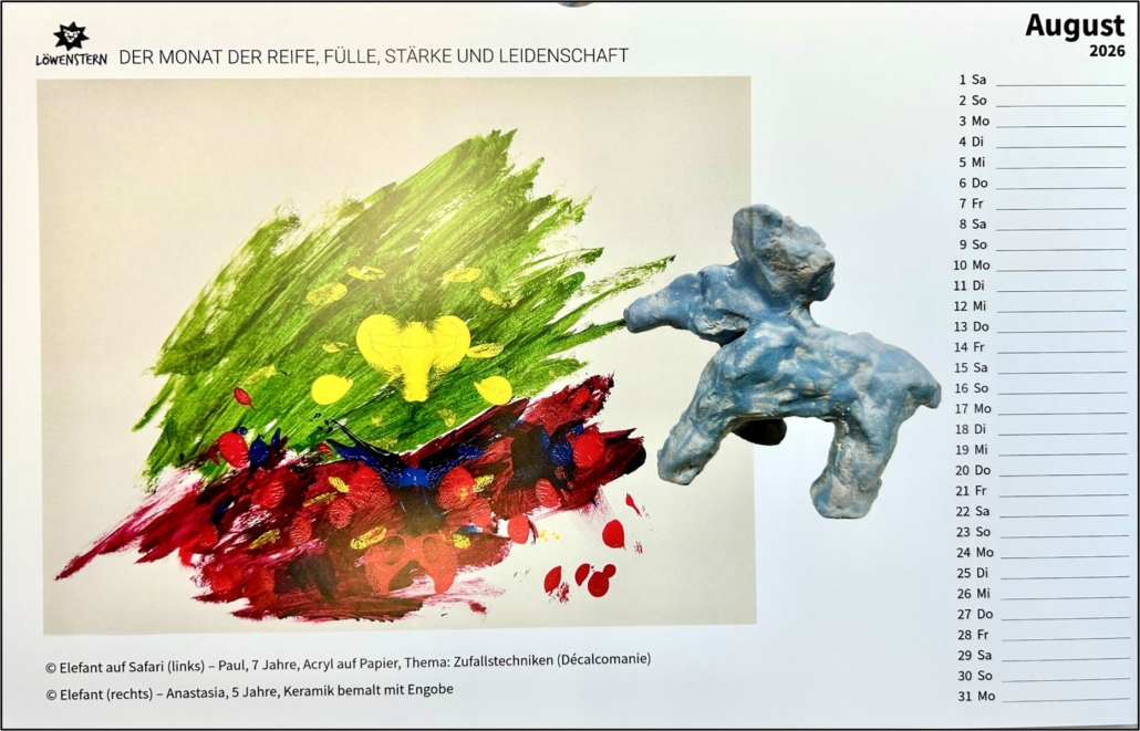 – so lautet die Beschriftung des Kunstwerks für den Monat August im neuen Löwenstern-Kalender 2026: mit Titel des Bildes, Vornamen und Alter des Kindes sowie der eingesetzten Kunsttechniken.