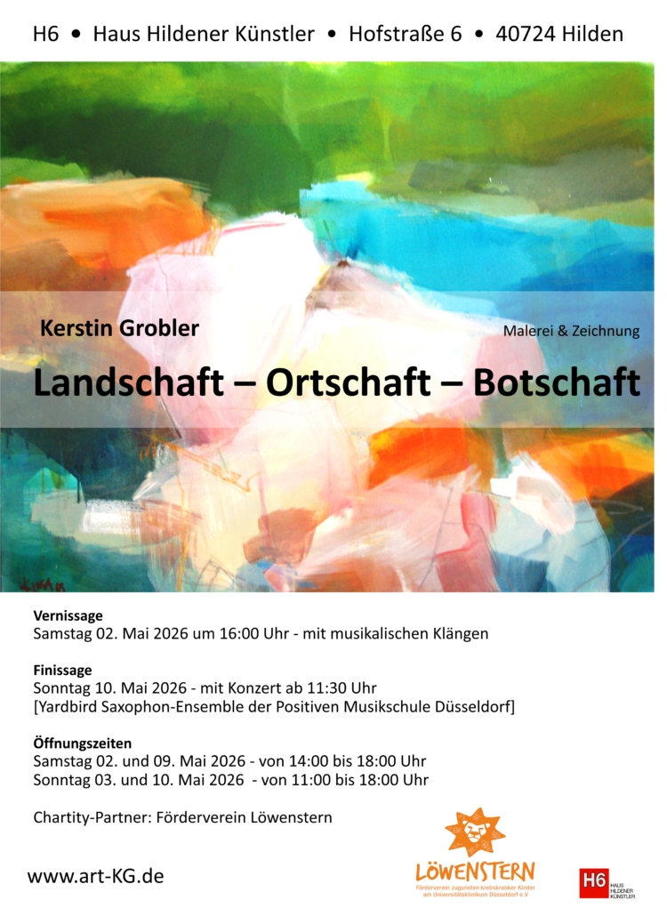 Die zeitgenössische Künstlerin Kerstin Grobler wird ihre wunderbaren Kunstwerke vom 02.-10.Mai 2026 im Rahmen einer Vernissage im Haus der Hildener Künstler, H6, Hofstr. 5 in Hilden, vorstellen. Unter dem Motto „Landschaft-Ortschaft-Botschaft“ will sie die Besucher beeindrucken und begeistern. Charity -Partner ist Löwenstern e.V., der sich Vorort oder online über Spenden sehr freuen würde.