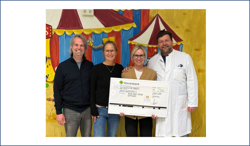 Bild oben: von li. nach re. Thorben Soer und, Dr. Yvonne Soer, Praxisinhaber; Stephanie Schuster, Vorsitzende Löwenstern; Dr. med. Friedhelm Schuster, Oberarzt der Klinik für Kinder-Onkologie bei der Spendenübergabe.